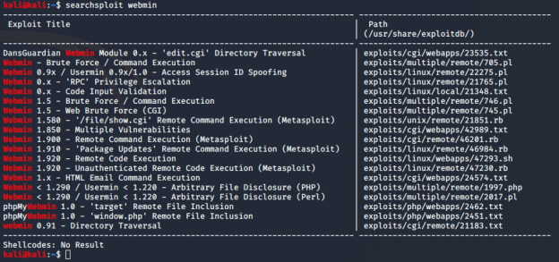 Based on the above results it appears that port 10000/tcp is being used by “MiniServer 1.910 (Webmin httpd)”. Another quick Google search and I find that Webmin is “a web-based system configuration tool for Unix-like systems”. This seemed like something definitely worth looking into. I did a quick search in Kali to see what exploits were available for Webmin and found the following results.