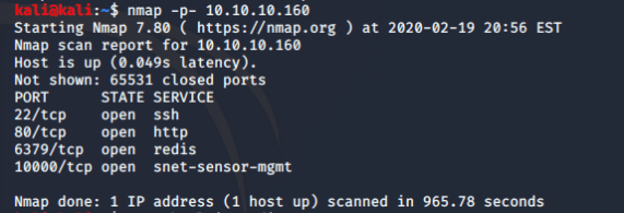 SSH and HTTP are both open but there are 2 other ports open that I am not familiar with. A quick Google search finds that 6379/tcp is used by a “data brokering” service called “redis”. Port 10000/tcp was a little more tricky so I ran another nmap scan against that specific port to get more information.