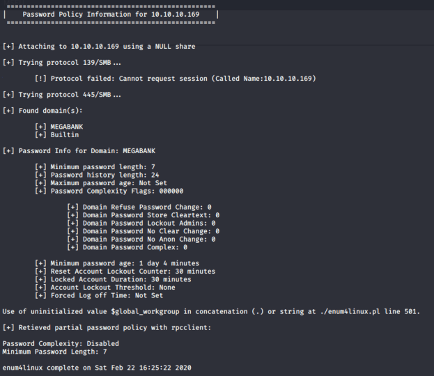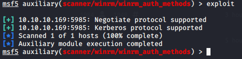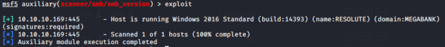 Immediately I saw that 5985 and 445 were open. Port 5985 is used by WinRM for remote administration using Powershell. Port 445 is used by SMB and can provide a plethora of information. I decided to start enumerating SMB for more information using the “smb_version” module in Metasploit. I ended up finding that the target system is a Windows 2016 Standard machine running build 14393. There is also an indication that the machine is part of the “MEGABANK” domain.