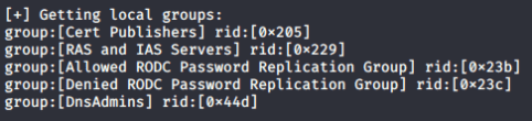 Here is a listing of the domain and local groups on the target machine using the enum4linux tool. A couple interesting groups to explore are the “DnsAdmins” and “Contractors” groups. The “Contractors” is especially interesting because most of the time contractors are given admin access to systems to perform work.