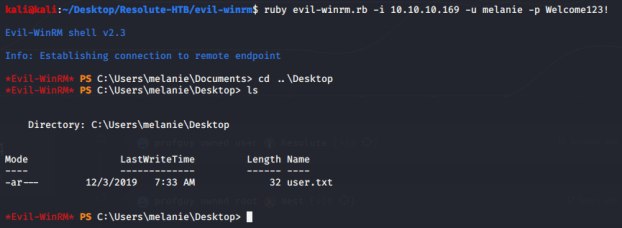 Now that I know the credentials I have work for SMB access, I used the “Evil-WinRM” tool to remote to the machine (using WinRM) with the previous credentials. I was presented with a PowerShell prompt and was able to obtain the user flag.