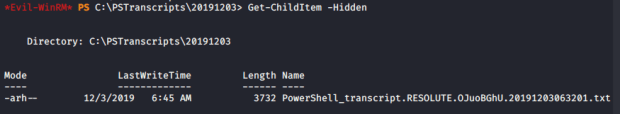With the new access I obtained using “melanie” I enumerated the target machine for more information. I saw a directory titled “PSTranscripts” on the root of the C:\ drive that seemed interesting. I went into the directory and eventually found a hidden file that appeared to be a transaction report for PowerShell.